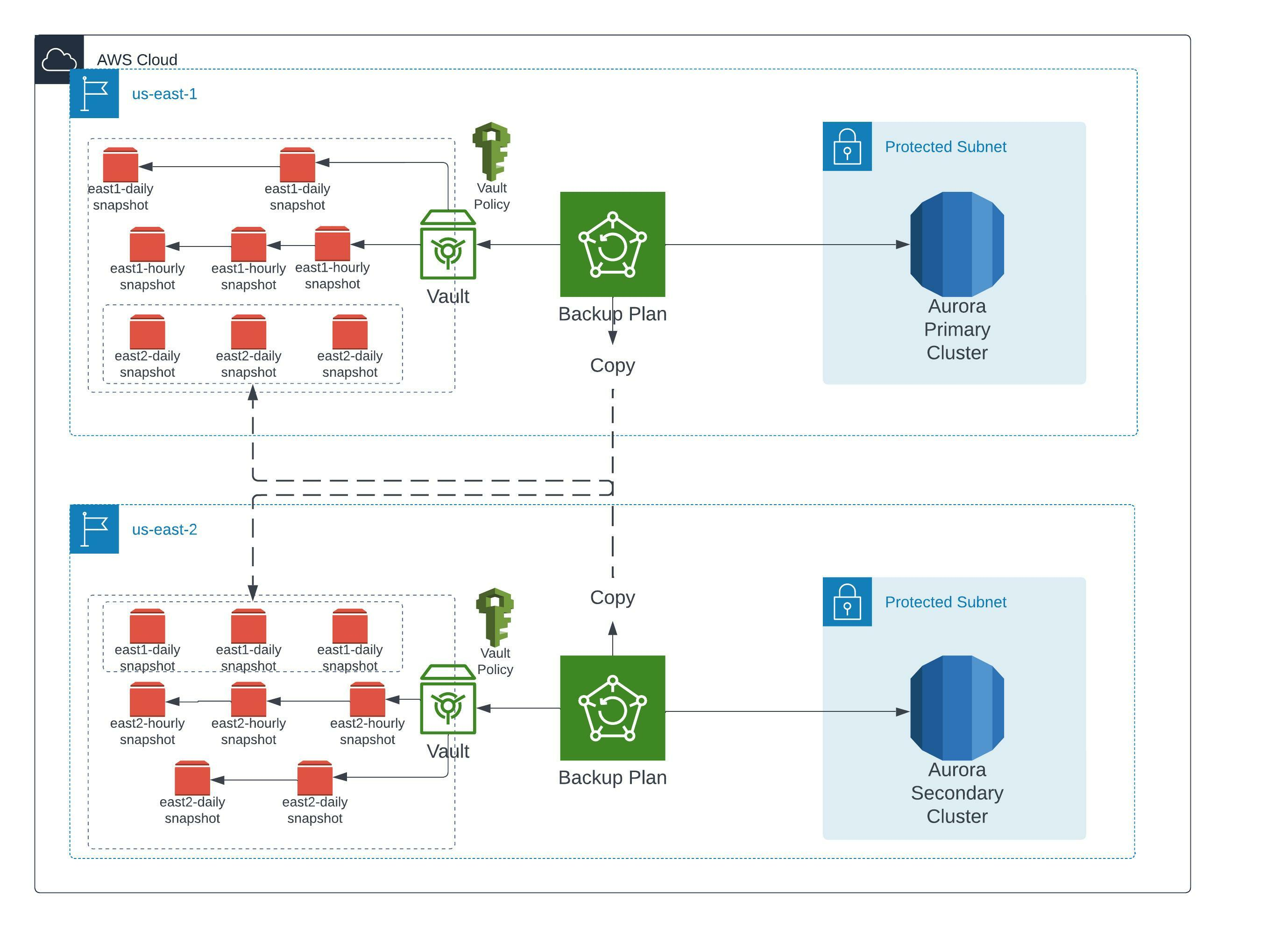 Thus, we decided to augment this solution with the AWS Backup offering from AWS. This allowed us to create backups at multiple time frequencies (every hour and day) and gives you the capability to copy your snapshots to vaults in differing regions. A picture of the architecture is below.